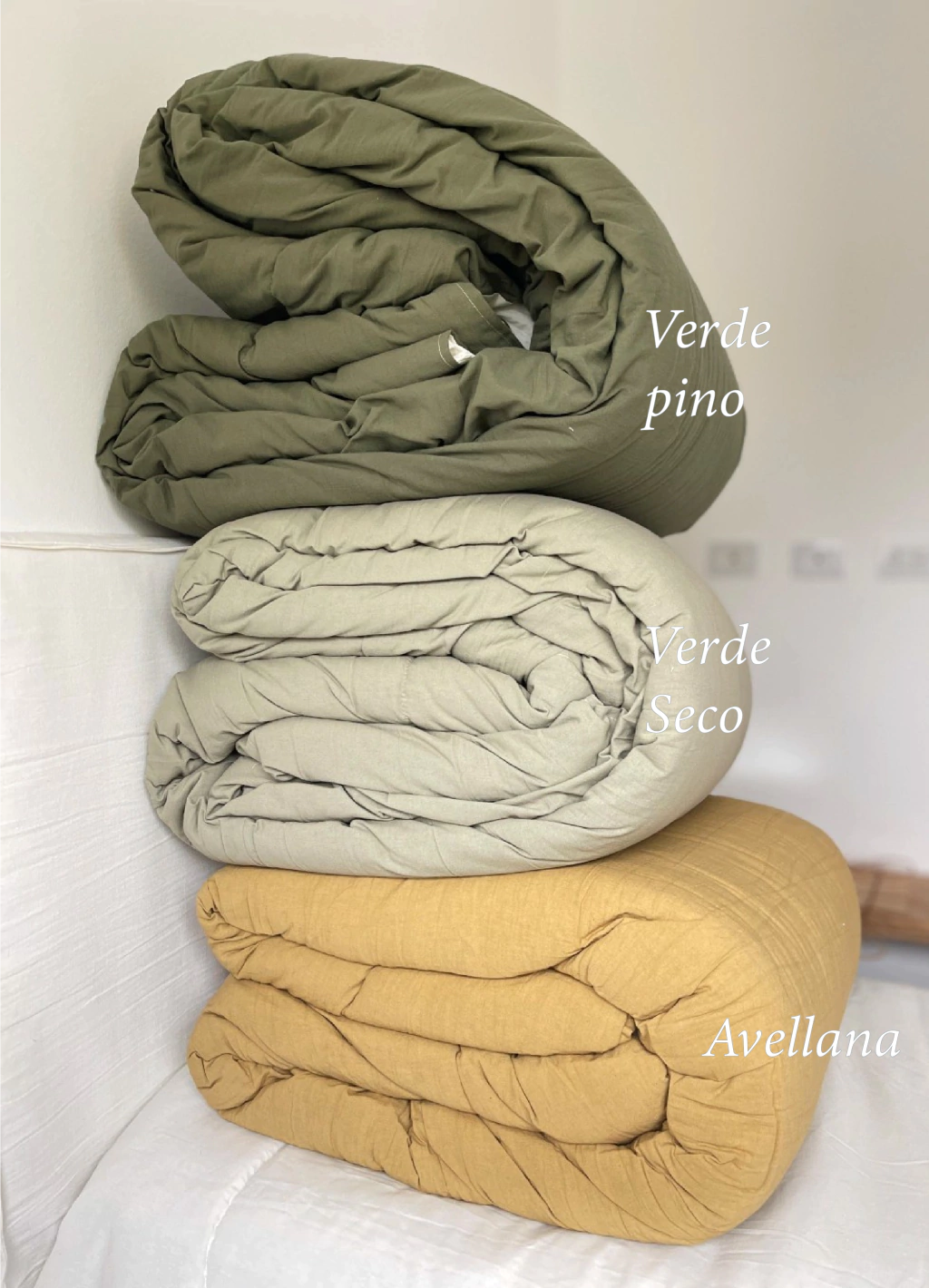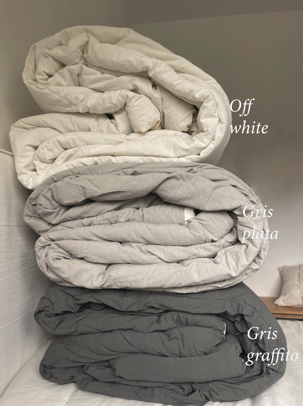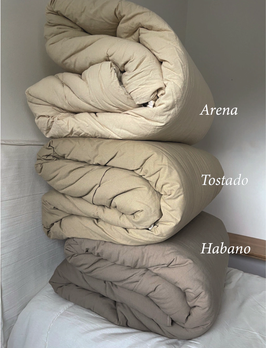 Está confeccionado de un lado en tusor (color a elección) y del otro lado en lienzo (siempre en color natural). Es decir, tenes 2 colores en un mismo acolchado para que lo uses como más te guste y combines con distinta ropa de cama.