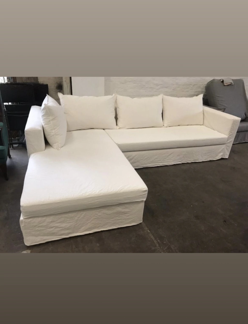 Tapizado en lienzo color crudo, con funda en tusor. Incluye: almohadones de asiento de placa Soft de alta densidad 28 kg, almohadones para el respaldo rellenos de vellón siliconado.