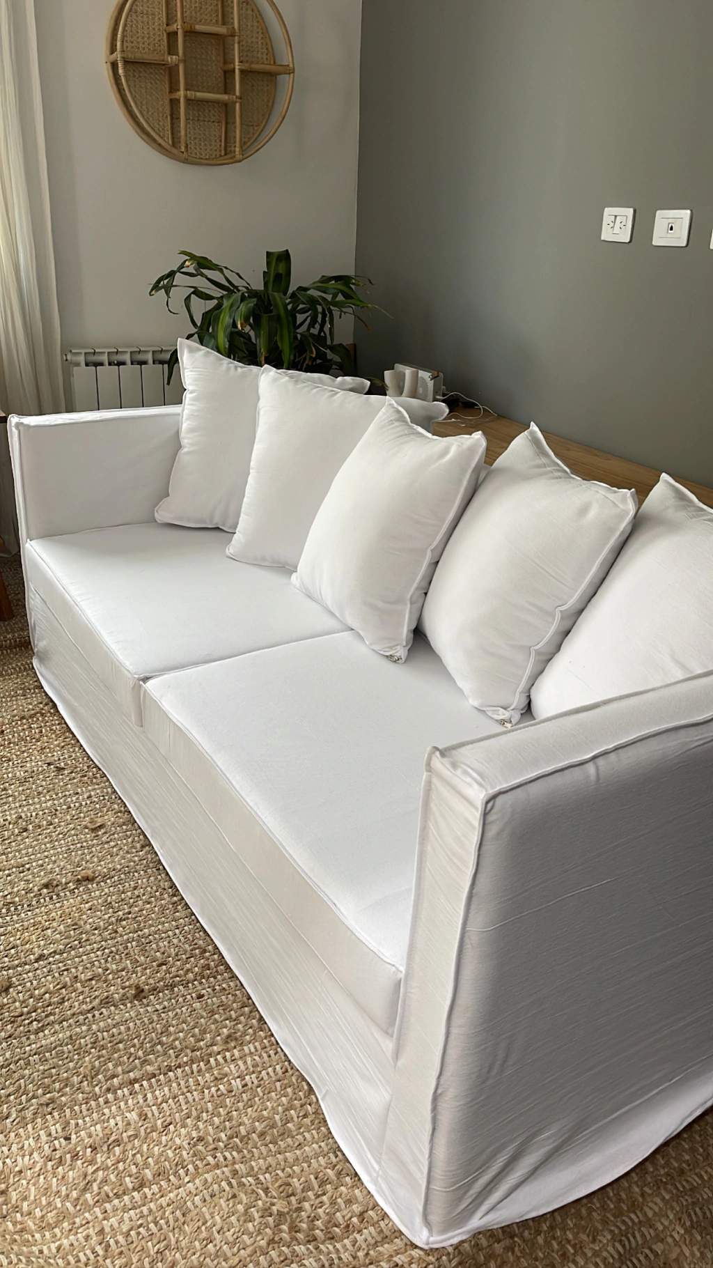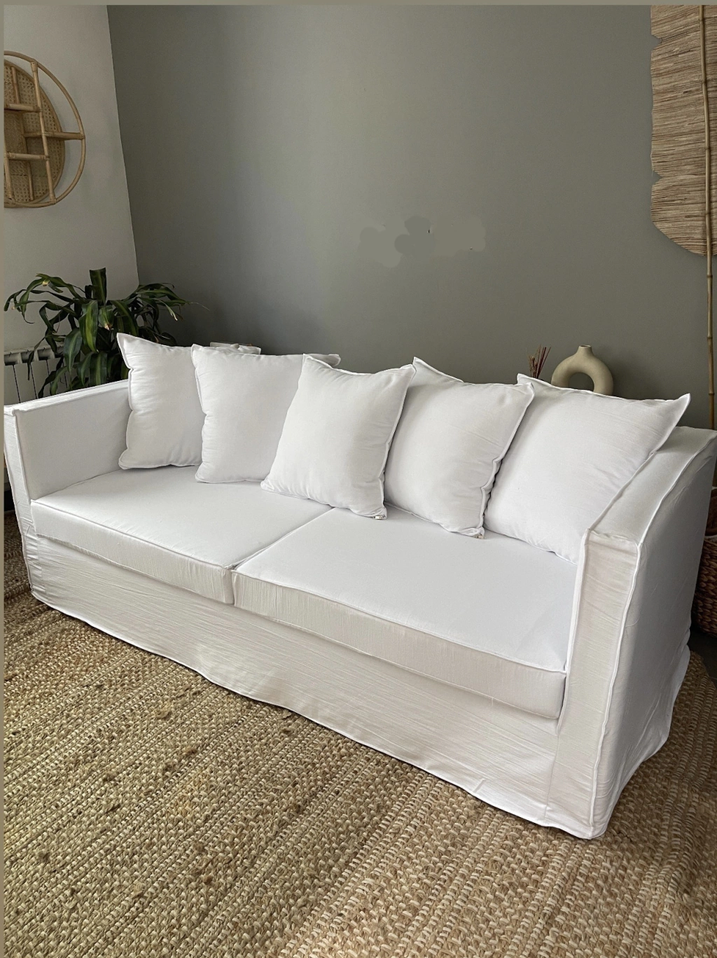 Tapizado en lienzo color crudo, con funda en tusor. Incluye: almohadón de base de alta densidad, almohadones para el respaldo. ¡Confeccionamos tu funda en color a elección! Son desmontables aptas Lavarropa.